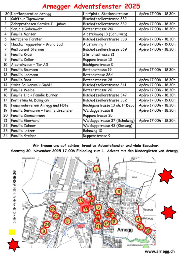 Am Sonntag, 10. Dezember 2023 um 17.00 Uhr sind alle Arneggerinnen und Arnegger mit ihren Familien herzlich zur Öffnung des Adventsfensters der Dorfkorporation eingeladen. An der Stationsstrasse bei der Graströchni und auf dem Dorfplatz.