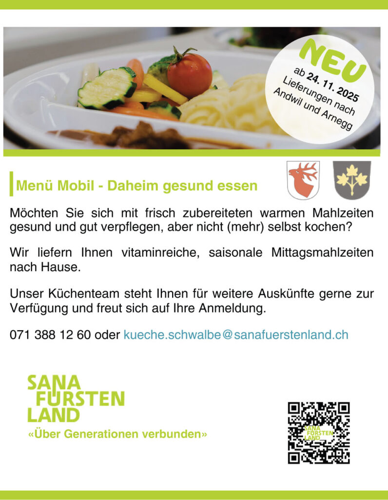 Weitere Auskünfte erhalten Sie direkt von Frau Karin Schiess, Geschäftsführerin der SanaFürstenland AG, am Seniorenzmittag im Otmarzentrum Andwil am 24. September 2025 um 12.00 Uhr.
